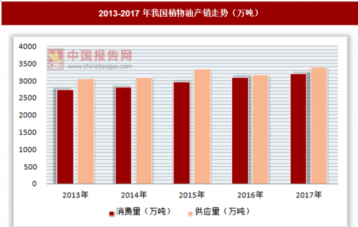 2017年我国国产、产量略有回升,其他油料产量继续减少。总体来说,国产油料压榨的植物油产量估计为635万吨左右,比上年减少30多万吨。