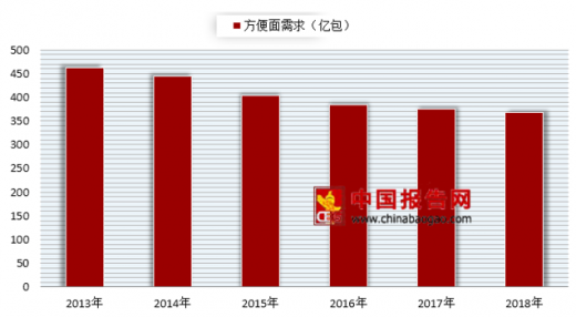 中国是全球最大的方便面产销国。自上世纪90年代以来,中国方便面营业额一度连续18年递增。然而,从2013年起,中国方便面行业开始走下坡路。到了2016年,内地和香港方便面年销量已下滑至385亿包。经历了持续多年的市场下滑之后,国内方便面市场开始回升。据中国食品科学技术学会的数据显示,2018年上半年,方便面行业销量增长4.5%,销售额增长8.6%。2017年中国方便面需求达到了375.6亿包,预计2018年我国方便面需求仍然在350亿包以上。中国方便面行业呈现出积极、稳健的增长态势。