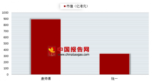 我国方便面整体市场状况在两大方便面生产巨头的业绩上有着显著体现。康师傅和统一的股价在2016年下半年到17年初跌至谷底,康师傅股票下跌更为明显,市值一度缩水50%。2017年,国内方便面市场零售额回升至841亿元,康师傅方便面、统一方便面营收额分别为226亿元和82亿元,分别占国内方便面市场的27%和10%,仍然为行业的巨头。
