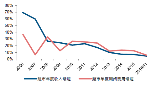 自2010 年开始,超市行业费用增速持续超过收入端增速,2016h1 超市行业费用同比增长5.87%,增速同比下降6.64 个百分点;2016h1 超市行业费用率为19.00%,同比提升0.25 个百分点。2016q2 超市行业费用率为20.43%,同比提升0.11 个百分点,环比提升2.58 个百分点。