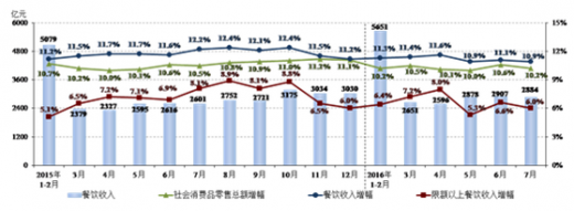 经历过2015年全年强势回暖之后,进入2016年,餐饮市场发展速度减缓并趋于稳定。2016年1-7月,全国餐饮收入19567亿元,同比增长11.2%,增幅比去年同期回落0.4个百分点。限额以上单位餐饮收入4967亿元,同比增长6.5%,较去年同期下跌0.1个百分点。餐饮收入增速与社会消费品零售总额增幅的差距比2015年底略微收窄至0.9个百分点。