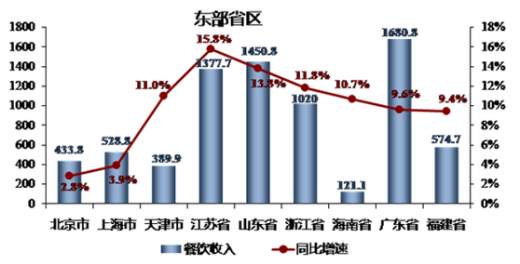 受经济形势下行以及部分地区政策连锁反映的影响,再加上本身餐饮产业规模庞大,一些传统餐饮产业大省区餐饮市场发展步伐都初显放缓迹象,进入稳增长阶段。北京市、山东省、福建省、四川省同比增速上涨幅度都有不同程度的降低,上海市、天津市、广东省、河南省、湖北省等地增速甚至低于去年同期。