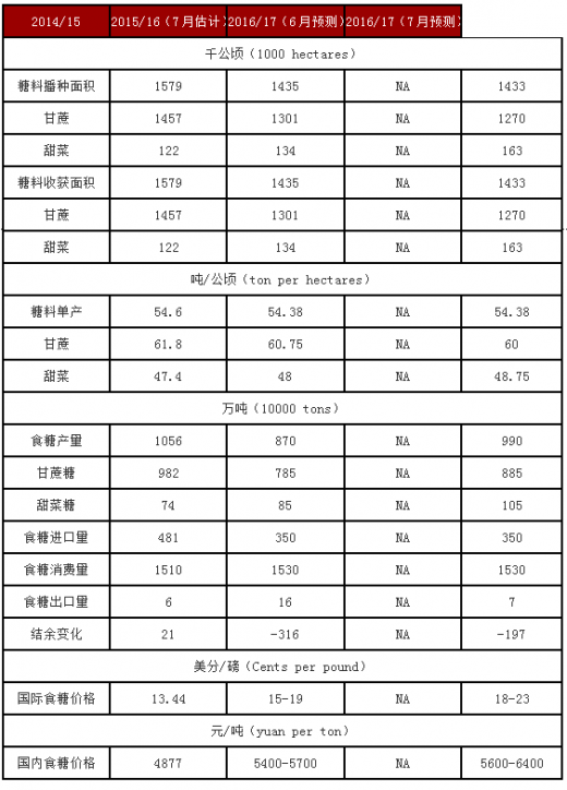 2016/17年度中国糖料播种面积将达到1433千公顷,与上年度基本持平。近期,北方甜菜产区雨水较多,有利于甜菜生长,甜菜单产有望比上年度每公顷提高0.75吨;广西、云南蔗区雨水偏多、低温寡照,甘蔗苗数和株高同比均有所下降,预计2016/17年度中国甘蔗单产比上年度每公顷减少0.75吨。