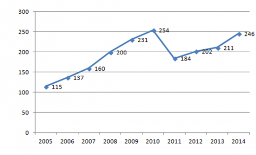 2005-2014年中国含乳饮料和植物蛋白饮料行业公司数量