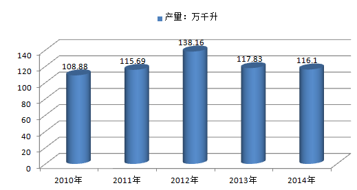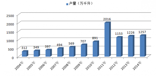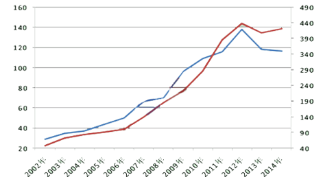 2002-2014年中国规模以上葡萄酒生产企业葡萄酒产量及主营业务收入增长趋势图