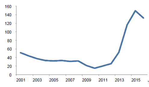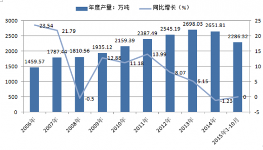 2004-2015年中国玉米产量及期末库存(百万吨)