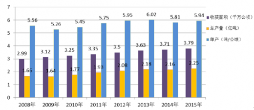 玉米生产的发展主要体现在种植面积的扩大,单产水平的提高,两相作用致使玉米总产量增长。根据美国农业部统计,2008年—2015年世界玉米的收获面积、总产量及单产情况如下: