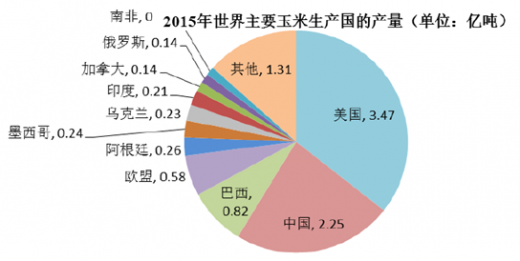 根据2015年世界主要玉米生产国的生产情况显示,2015年玉米产量位于前列的国家为美国、巴西、墨西哥、印度等,与2015年除草剂销售市场位于前列的国家分布基本一致。其中,美国和中国两国的产量超过世界总产量的一半,具体如下图所示:
