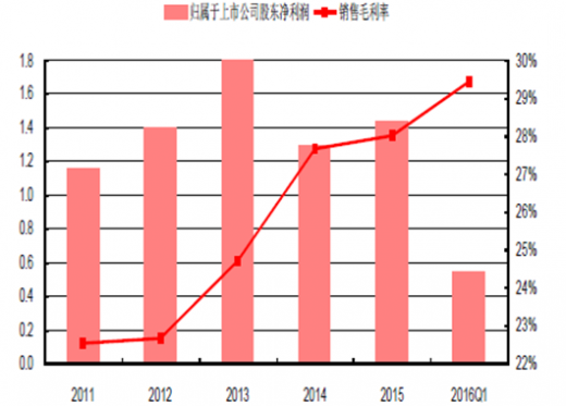 2015年,西王食品实现营业收入22.44亿元,同比增长19.97%;实现归母净利润1.46亿元,同比增长24.50%。2016q1,西王食品实现营业收入6.30亿元,同比增长1.99%;实现归母净利润0.54亿元,同比增长10.05%;受益于毛利率的持续攀升,其净利润弹性高于收入弹性。