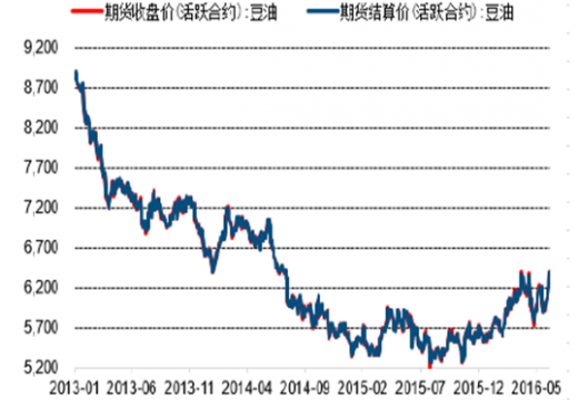 2013-2016年豆油期货活跃合约收盘价(元/吨)