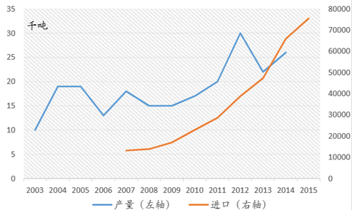 国产奶酪生产量2004年以来基本稳定,进口量快速增长