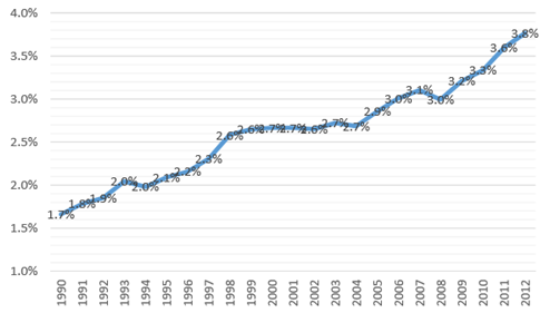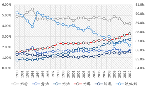 1990年以来,日本奶酪产量 (不含进口)占奶制品产量比重从1.50%提高到2012年的3.26%; 其奶酪产量同液态奶产量比例在 2012 年已经达到 3.77%,如果简单换算成液奶,这一比例为15%以上。