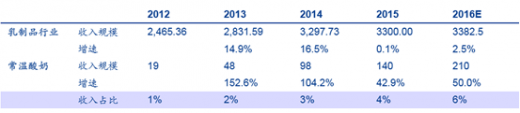 2013年在常温酸奶起步放量阶段判断行业规模将超过200亿元,2015 年预计已经达到140亿元,2016年大概率超过200亿元。常温酸奶占乳制品行业收入比重已经超过 4%,且增速显著高于行业整体,对行业增长贡献 越发明显。