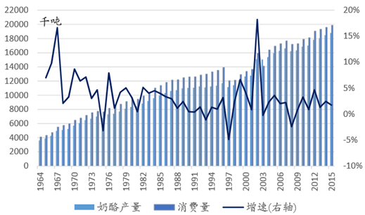 全球奶酪产量消费量仍在增长(右轴为产量增速)