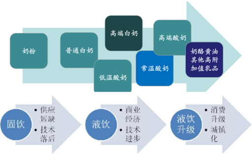 从我国欠发达地区(主要以冷链发展程度区分)的奶制品的消费脉络来看,会呈现明显的“奶粉→普通白奶→高端白奶→常 温酸奶”的消费演进路径,而在城市则是“巴氏奶→酸奶→高端白奶→高端巴氏奶和高端酸 奶”的演进路径,这两者均已得到验证,未来向“巴氏奶→酸奶→高端白奶→高端巴氏奶和 高端酸奶→奶酪黄油”演进将是确定性非常高之事件。