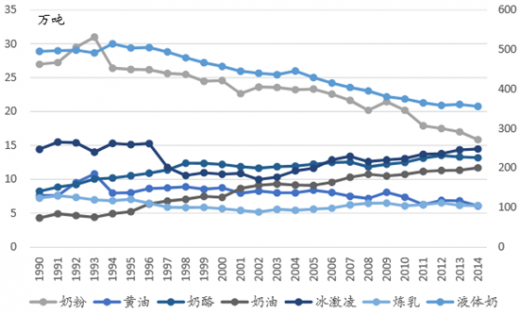 日本乳制品产量情况(1990-2014):液奶、奶粉类产量盛极而衰、奶酪奶油等产量上升