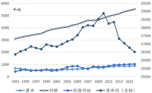 美国乳制品消费趋势(品类对比):奶酪消费量增长趋势明显