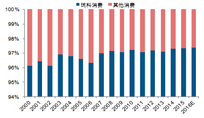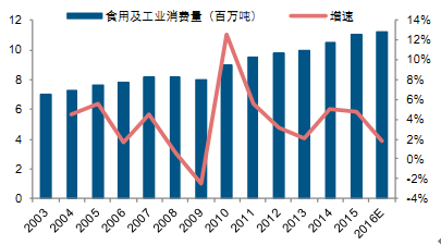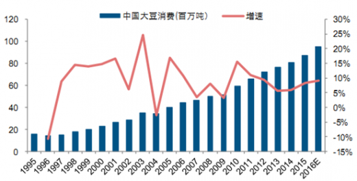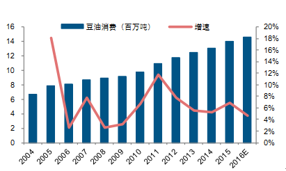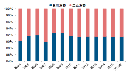 大豆需求主要来自压榨,其拉动因素一是饲料养殖业对豆粕需求的增长,二是食用油需求的刚性增长。预计 16 年中国大豆需求继续增长,主要基于:(1)豆粕消费中90%以上是用于各类饲料,所以饲料行业景气度状况对豆粕需求的影响非常明显。随着能繁母猪和生猪存栏量的逐渐回升以及猪价持续上涨,饲料企业将迎来销量的全面增长,对豆粕的需求量将大幅增加。(2)豆油在我国主要用于食用,占总消费量的 85%以上,食用消费是拉动豆油消费的主要因素,随着中国经济企稳,豆油消费将继续稳健增长,这些因素将带动中国大豆需求继续增长,预计 2016 年中国大豆消费 9525 万吨,同比增长 9.23%。
