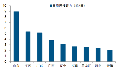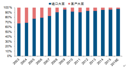 大豆进口大量增加与 2000 年以来我国大豆压榨产能迅速扩张也有很大关系, 2000 年我国日压榨大豆300吨以上的油厂在100家左右,全年大豆压榨能力首次突破1000万吨。2015 年进口大豆压榨量为 6950 万吨,占榨油消费总量的 96.5%。企业压榨进口大豆具有很高的积极性,主要因为(1)进口大豆成本低,相较国产大豆具有价格优势,因而压榨进口大豆利润更高;(2)压榨企业的生产能力向沿海地区集中,地理位置方便利用加工进口大豆。
