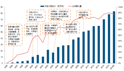 我国耕地面积基本饱和,大豆产量的增长受到了制约,而 20世纪 90 年代中后期以来,由于我国经济保持持续快速增长,对蛋白需求的迅速增长带动大豆需求的迅速增加,而国内大豆生产增长相对缓慢,大豆产需缺口不断增大,增加进口成为弥补国内需求缺口的唯一选择。1996 年是中国大豆贸易的转折点,中国由大豆净出口国转为净进口国,此后进口量逐年上升,成为全球最大的进口国。2015 年中国进口大豆 7835 万吨,占全球大豆进口的 63.4%,是国产大豆产量的 6 倍,占国内大豆消费量的 90%左右,大豆消费对外依存度逐年提升。
