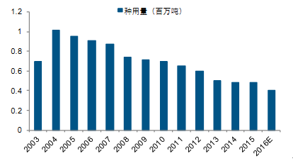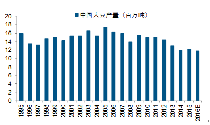 我国大豆产量位居世界第四,从生产格局看,东北产区、黄淮海产区和南方产区是中国大豆主产区。其中,黑龙江是我国最大的大豆生产基地,大豆种植面积约占全国的 40%。2015 年中国大豆种植面积 680万公顷,比历史最高的 2005年减少了 279 万公顷,降幅达到 29%,15/16 年度大豆产量预计为 1180 万吨,同比减少 2.88%,比 04/05 年度的最高值减少 560 万吨,降幅高达 32.2%。