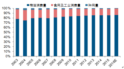 我国大豆的消费结构主要分为榨油消费、食用及工业消费和种用。2003—2015 年国内消费量持续增加,复合增长率为 7.83%;与此同时,压榨消费量也迅速增长,复合增长率 8.4%,占国内消费量的比重稳定在 80%左右;食用及工业消费量有所增长,到 2015年达到 1100 万吨,占国内消费的 12.7%;种用大豆消费量则有所下降,2015 年仅为48 万吨,占国内消费的 0.56%。可以看出,我国大豆榨油消费量比重持续上升,食用及工业消费和种用比重持续下降,近年来中国大豆需求量增长的主要原因是榨油大豆需求的增加。