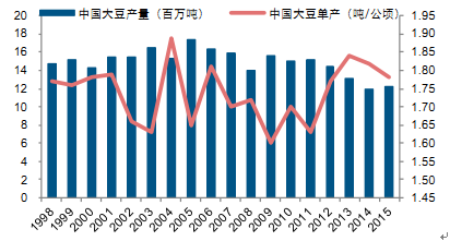 2014 年我国停止大豆收储政策,对东北和内蒙古大豆开始目标价格直补试点,放开国产大豆市场,受此政策影响,国产大豆种植面积和产量并未继续下降,开始出现企稳态势。2014 年全国大豆种植面积为 685 万公顷,在经历了从 08 年开始连续 5 年下降后终于止跌,由于单产水平的提高,大豆产量下降幅度低于种植面积下降幅度。