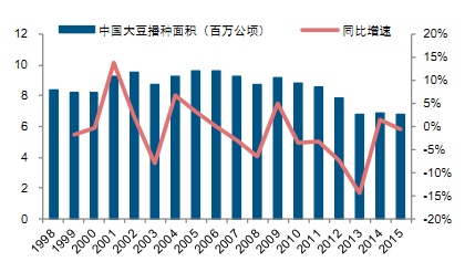 种植结构调整有望提升国产大豆种植面积与产量。国家层面已经开始农业供给侧结构性改革,计划到 2020 年,调减玉米种植面积 5000 万亩,其中 2016 年力争调减 1000 万亩;2016年 4 月农业部印发《关于促进大豆生产发展的指导意见》,提出到 2020 年大豆面积达到 1.4 亿亩,比目前增加 4000 万亩。由于大豆种植主要受比较收益的影响,而由于玉米价格大跌、临储政策取消的影响,农民种植玉米的意愿也有所降低,预计这将扭转国产大豆播种面积减少的态势。