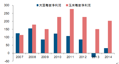 大豆种植面积自 2009 年以来不断下滑的主要原因是大豆种植比较收益低。2009 年以来,由于玉米消费强劲,价格上涨较快,2014 年玉米平均出售价格为 112元/50 公斤主产品,比 2008 年上涨54.3%。而国产大豆市场受进口大豆挤压,价格上涨较慢,201年大豆平均出售价格为 219 元/50 公斤主产品,比 2008 年上涨了 19.1%,涨幅远低于玉米。因此大豆与玉米的价格比价越来越低,并自 09 年起低于成本比价且差距逐渐扩大。种植玉米的每亩净利润始终高于大豆,从而导致农民由种大豆改为种植效益更高的玉米。尤其是东北地区,2014年黑龙江种植玉米的每亩净利润为 203 元,而种植大豆的每亩净利润仅为 31 元,二者相差将近 6 倍。