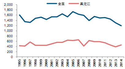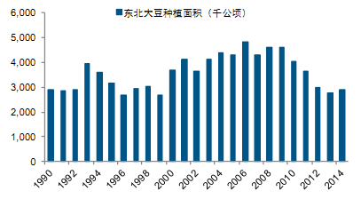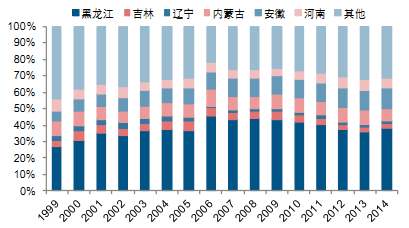东北地区大豆质优粒大,含油率高,是我国最大的大豆生产基地。虽然东北产区大豆单产仅处于全国中游水平,但东北地区土地资源较为丰富,适合大豆等机械化种植的作物,因此东北仍是全国最主要的大豆产区。从 2009 年开始,东北大豆播种面积开始逐年下滑,其中,黑龙江是全国大豆播种面积最大的省份,近年来降幅明显。2014 年黑龙江大豆播种面积 258 万公顷,同比增长 6%,在经历了连续5 年下降后略有上升,比 2008年减少 146 万公顷,降幅达 36.2%,比 2006 年最高值减少 167 万公顷,降幅达 39.3%。