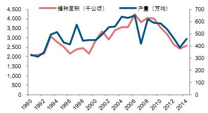 从产量来看,自 1993 年以来,黑龙江大豆年产量始终处于 400 万吨以上,占全国总产量的 40%左右。其中,2006年达到历史最高点 653 万吨,2008 年以后进入减产周期,并在 2013 年跌破 400 万吨,仅为 387 万吨,2014 年产量有所恢复,回到 460 万吨。从大豆总产量的影响因素来看,黑龙江大豆产量基本上随播种面积的变动而变动,也就是说,近几年大豆总产量下降主要是因为大豆播种面积减少。