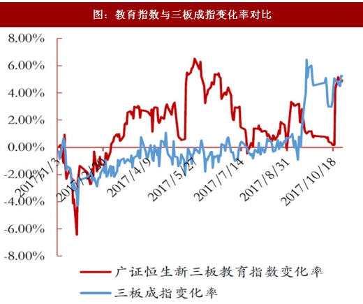 2017年以来(截至2017年10月27日),广证恒生新三板教育指数大部分时间处于高位震荡,小幅上涨了4.91%,跟三板成指基本一致,领先三板做市13.92pct。