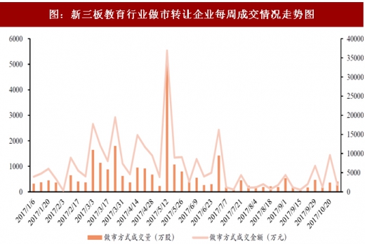 新三板教育行业目前做市转让企业为29家,2017年以来其成交量为2.64亿股,成交金额为27.80亿元,分别占新三板教育行业总成交量与总成交金额的41.41%与47.00%。