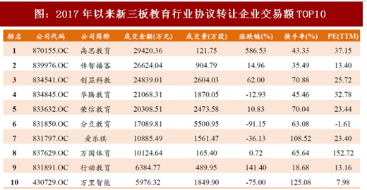 目前新三板教育行业协议转让企业总计246家,其中101家2017年以来有交易记录。总成交量为3.73亿股,总成交金额为31.35亿元,市场占比分别为58.59%与53.00%。协议板块历史成交波动较大,明星个股的阶段性放量交易往往带动协议板块的交易行情。