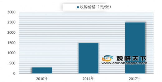 而受到毛驴数量减少带来的原材料供应紧张的影响,我国驴皮收购价格近年来出现明显上升,2000年,我国驴皮收购价格仅为25元/张,2014年迅速增长至1500元,直到2017年末,我国驴皮收购价格已经达到2500元/张。