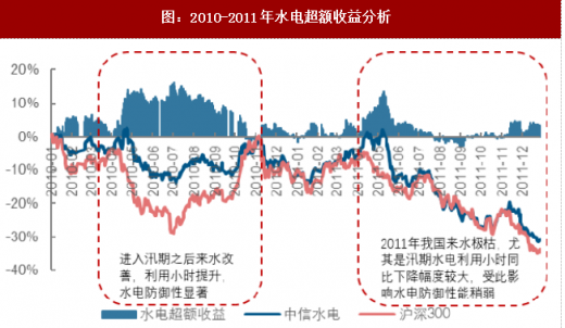 若无其他因素影响,来水偏枯将弱化水电投资防御性能。2010-2011年我国市场处于震荡下行的趋势中。在此期间,2010年一季度受到2009年全年来水偏枯的影响,存水不足发电量表现较弱,但进入汛期之后来水转丰,利用小时同比提升,水电板块的超额收益由弱转强;2010年年末由于行情调头向上,水电在上涨行情中优势不显,超额收益随之收窄;2011年4月市场行情再次向下,但是当年汛期我国来水极枯,水电超额收益进一步被压缩,防御性表现较弱。