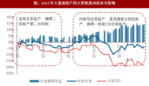 装机增长提升水电发展预期,对投资防御性有积极影响。在来水偏枯的2013年,由于锦官电源组、向家坝水电站和溪洛渡水电站集中投产,加强了水电行业的未来展望。除了上述大型水电站以外,2013年本身也是全国水电投产大年,在全行业装机实现大幅增长的前提下,水电行业在2013年行情不弱反强。