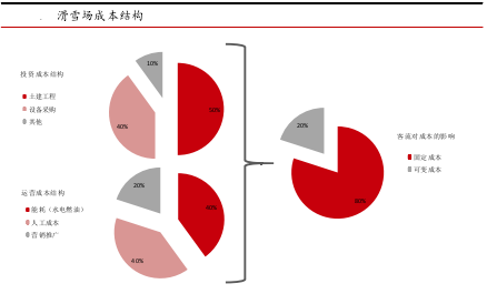 滑雪场的投资成本一般分为土建工程、设备采购和其他成本,大体的支出比例在 50%、40%、10%左右。运营成本主要分为三部分,(水、电、燃油)、人工成本和营销推广,比例约 40%、40%、20%。