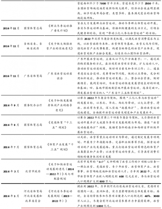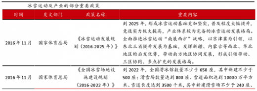 其中,《冰雪运动发展规划(2016-2025 年)》中明确提出:到 2022 年,我国直接参加冰雪运动的人数超过 5000 万,并“带动 3 亿人参与冰雪运动”。