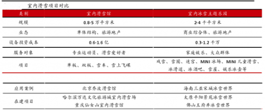 室内雪场 室内雪场按照规模一般分为室内滑雪场和冰雪世界/乐园两类,初期的投资比例一般为:建筑-55%,设备 30%,运营及其设施-15%。