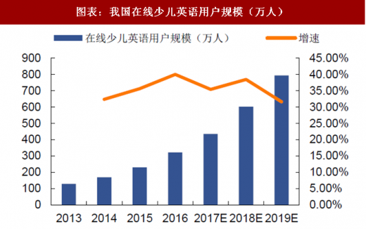 在线少儿英语市场火热,2016年达到20亿&300万。根据艾瑞咨询,2016年在线少儿英语行业市场规模达到19.7亿元,同比增长速度为45.4%,艾瑞咨询数据显示,2016年在线少儿英语用户规模(包括非付费产品的使用用户)为321.5万人,同比增长40.0%;预计在线少儿英语教育用户规模将保持30%以上的速度继续增长,到2019年预计达到793.9万人,在线少儿英语教育的市场规模到2019年将超过50亿元。一方面由于新生代网民规模的稳步扩大;另一方面国内在线少儿英语教育产品不断推陈出新,优化服务,将吸引更多家长和儿童参与其中。
