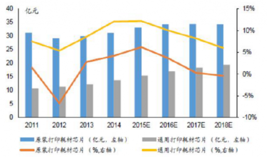 目前,全球打印耗材芯片全球打印机耗材芯片约在20亿美元左右,整体较为平稳,受专利壁垒等的影响,通用耗材处理芯片营收仅占专用打印耗材芯片的25%左右。