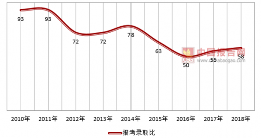 从国考报名与招录人数比例来看,2010、2011年国考报录比处于93:1的高位,随后国家政策变化,以及招录人数的提高,报录比波动下滑。2017年国考报录比为55:1,最终参考人数与招录人数比例为36:1;2018年国考报录比为58:1。