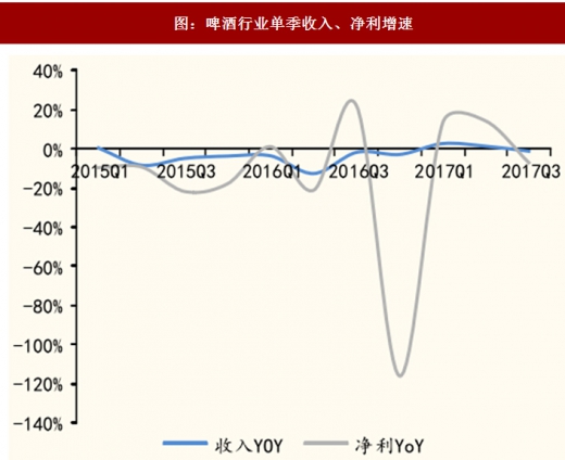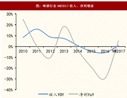 啤酒行业整体弱复苏趋势基本得到确认。我国啤酒行业中低端啤酒占据产量绝大多数,2016年整体来看行业延续产量下滑、产能出清,但下滑趋势有所放缓。而自16年8月开始,月度数据自2014年7月以来单月产量数据同比首次出现回升,虽然随后数据略有反复,但我们认为行业总体正在走出最低谷,进入弱复苏态势。截至2017年10月,国内啤酒产品同比增长0.20%,有望结束14-16年连续三年的产量负增长,啤酒行业整体弱复苏趋势基本得到确认。