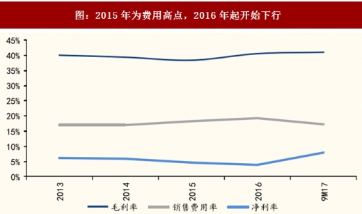 净利润方面较营收端显现出更大的弹性一一2017h1上市公司利润总额合计增速为18.25%。在盈利能力和费用投放上公司也在趋于好转,15年发现行业增速下滑后,各企业还尝试通过价格战在逆境中抢夺市场份额,这导致了2015年的期间费用率为近年的高点,净利水平较低;2016年开始各企业统一策略,进行了费用收缩;而进入2017年,费用率继续下行的趋势更加明显。