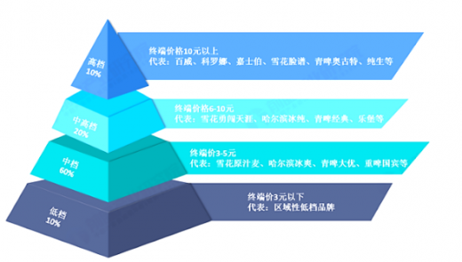 从企业规模来看,我国啤酒制造市场上中小品牌居多,占70%;而高档和中高档品牌占10%和20%左右。