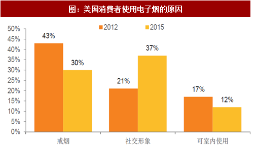 圣地亚哥州立大学公共健康专家约翰w艾尔斯,通过分析2012年-2015年间超过300万条关于电子烟的公开推特信息,研究了人们使用电子烟的原因。结果显示,2012年美国43%的电子烟消费者主要因为戒烟需求而使用电子烟,21%则因为社交需要,还有17%因为可以在室内吸食而选择电子烟。到了2015年,戒烟需求降至了30%,而社交需求则提升至了37%,我们认为这主要是由美国电子烟市场持续发展的vape文化的传播所导致的。