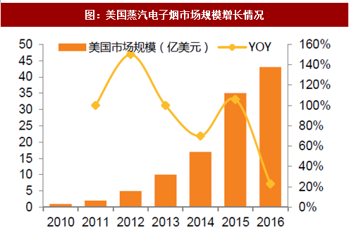 美国是世界上最大蒸汽电子烟市场。2016年美国电子烟市场规模约43亿美元,6年复合增长率87.1%,但今年来增速有下降趋势。2011-2015年可以说是美国蒸汽电子烟发展最快速的时期,在这段时间里美国电子烟的消费人群和消费文化都是从无到有,逐渐发展壮大。