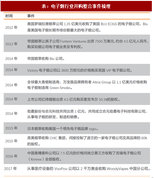 近几年来我们还观察到,一些相关行业的龙头公司也开始不断通过并购涉足电子烟领域,例如a股的烟标公司劲嘉股份和合元科技合资、锂电池公司亿纬锂能收购麦克韦尔、中国香精香料公司收购吉瑞电子烟等。