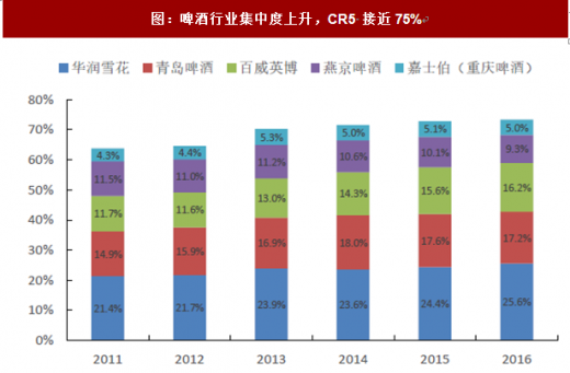图:啤酒行业集中度上升,cr5 接近75%